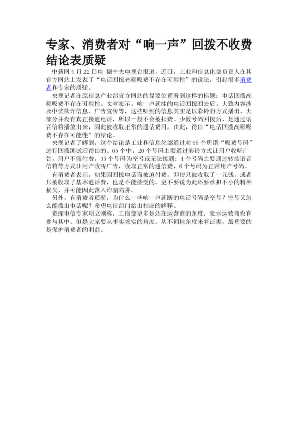 專家、消費者對“響一聲”回撥不收費結論表質疑(17.87KB)